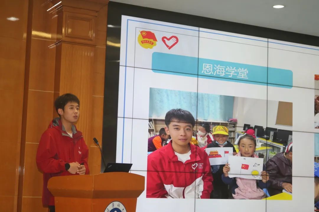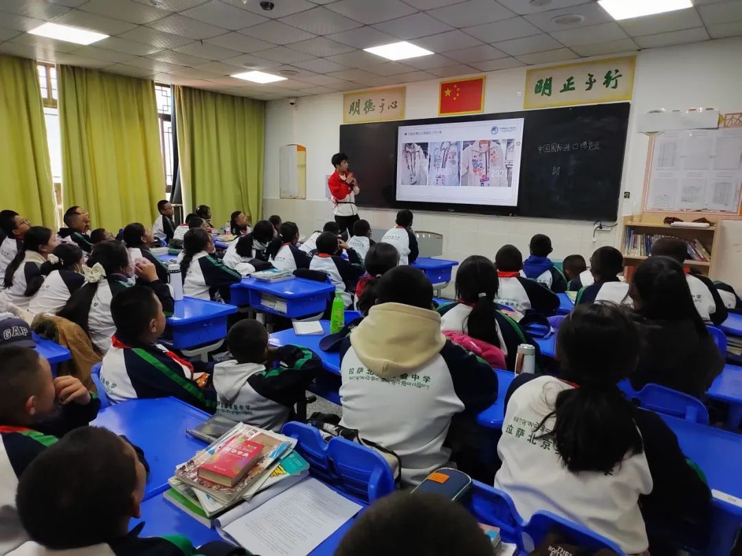 在服务单位工作之余,我还会积极参加各类志愿服务活动,我在当地的学校为同学们上了两堂课,一堂是以推普宣传周为契机,宣传推广普通话,为他们说好普通话、日后讲好中华民族故事打下基础。另一堂课是以不久前在上海举办的第六届中国国际进口博览会为契机,为同学们介绍中国式现代化和中国对外开放,开拓藏族小朋友们的眼界,让他们更加了解中国、了解世界。